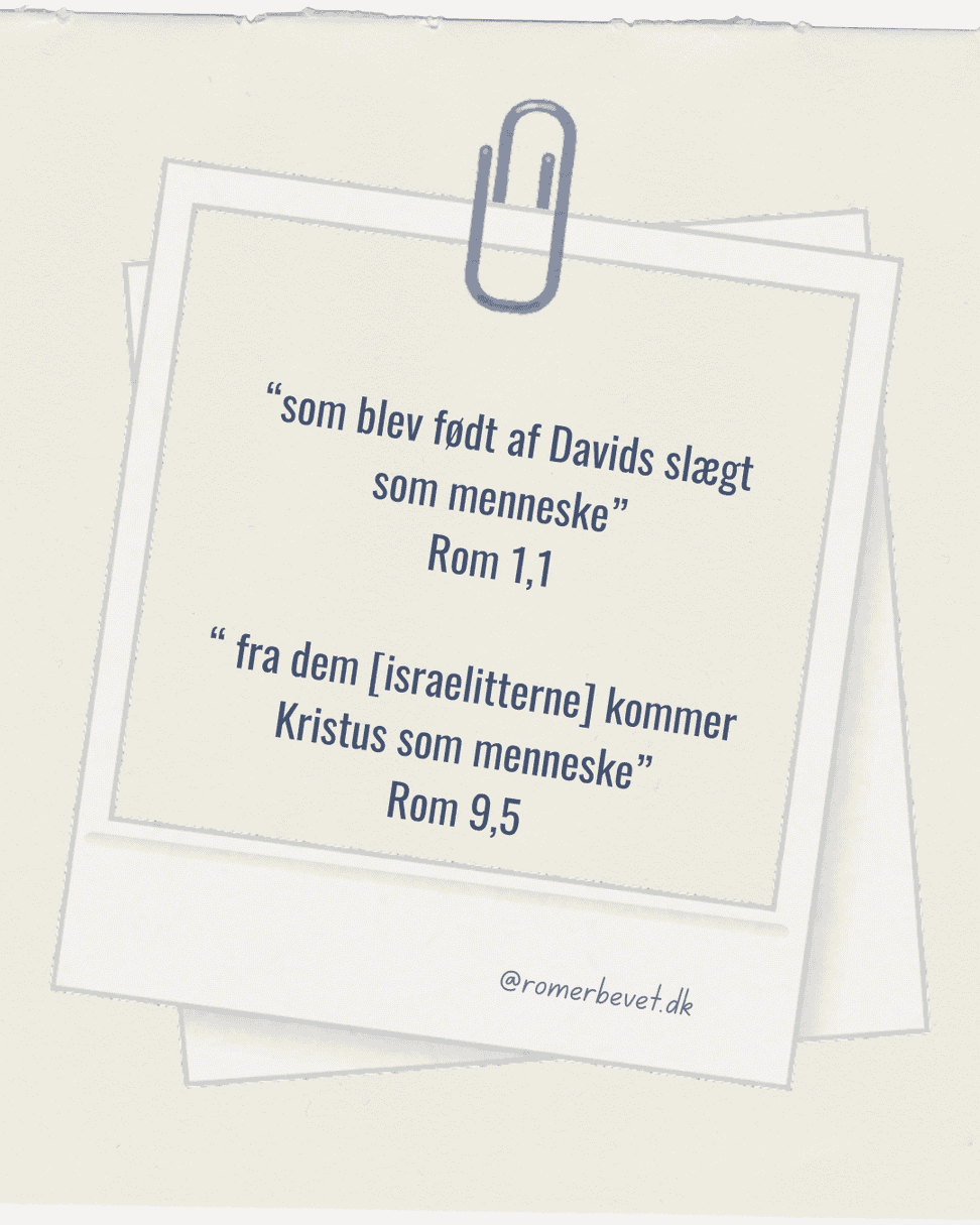 Jesus er kommet af Davids slægt. Jøderne vidste, at Messias ville komme af Davids slægt. Den tanke kommer også frem i Rom 9,5Henter…. I slutningen af brevet vender Paulus tilbage til temaet om Davidskongen. I 15,12 afslutter Paulus den sidste del af brevet af ved at citere Esajas’ profeti om at Isajs rodskud skal stå som et banner for folkeslagene. Isaj er Davids far, og det knytter tilbage til GTs tale om en ny David. GTs håb om en messias er opfyldt i Jesus.